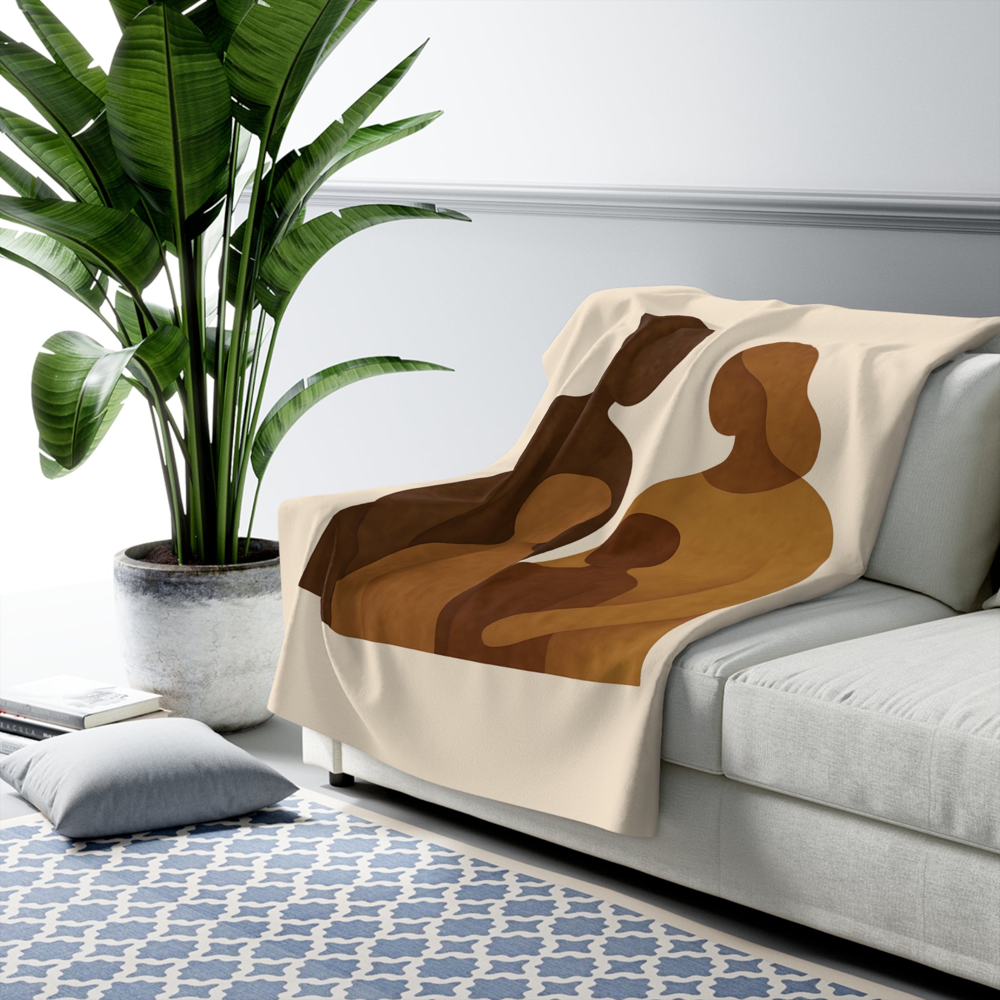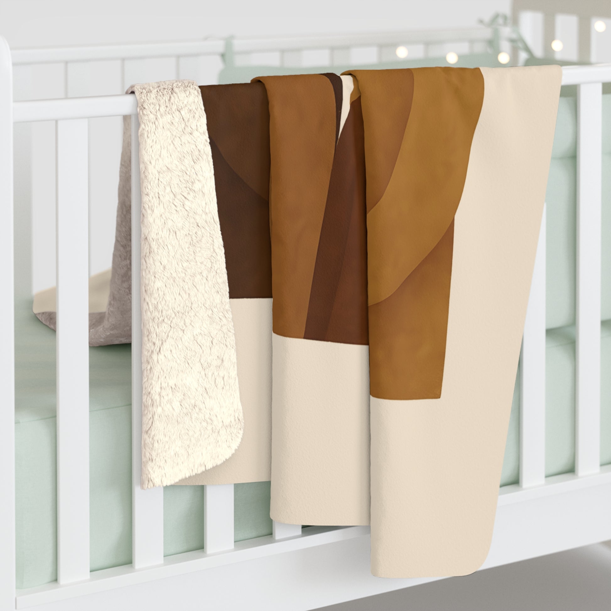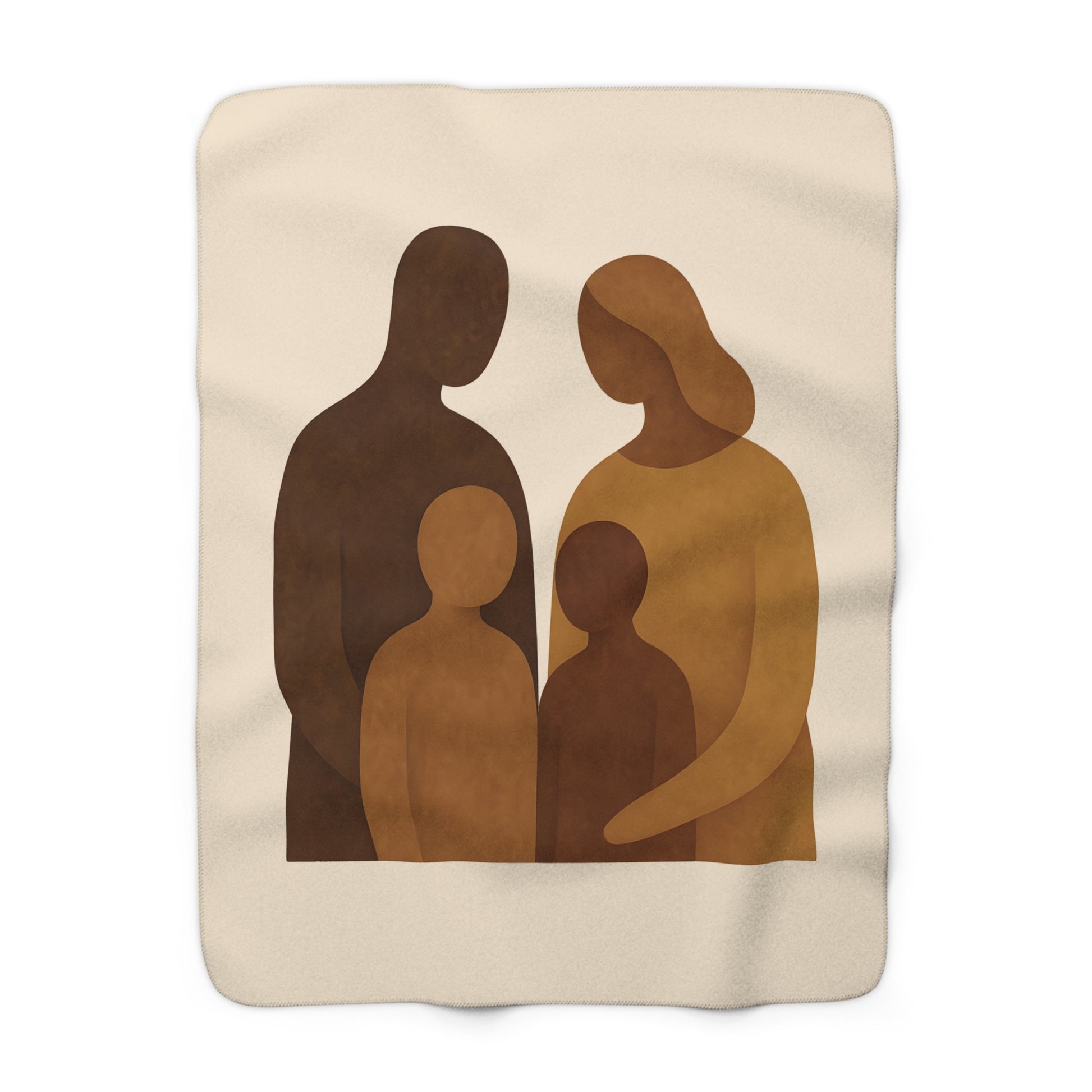 Ce plaid Sherpa vintage «Échos d’Hier» évoque la mémoire et la chaleur d’un foyer. Sans visage ni silhouette humaine, seules formes abstraites, courbes et textures suggérées racontent la tendresse, la transmission et les liens invisibles qui unissent une famille à travers le temps.